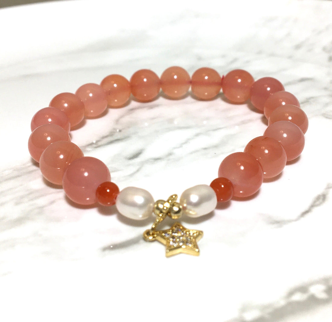 Pink Peach Agate Peal Star, Lovely Bracelet, Natural Gemstone Crystal Bracelet, SouthRedAgate, Gift for Her, Original Design, Lucky Bracelet