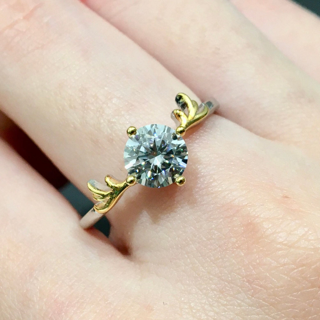Cute Fawn Deer Horn Moissanite Halo 1ct Ring, White Moissanite Ring for Anniversary Engagement 925 Silver &Golden plating Ring Gift for her