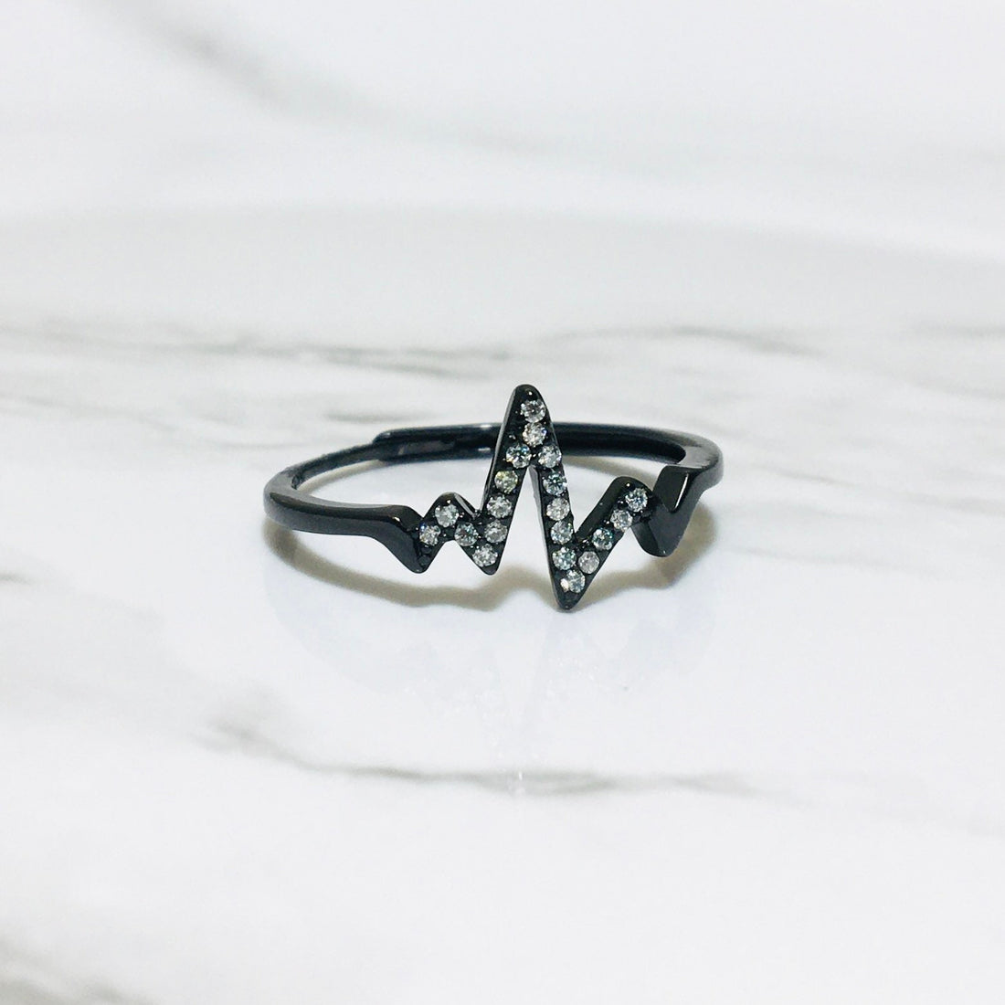 Dainty Moissanite Stacking Ring, Unique Design, Minimalist Fashion Pulse Heartbeat Ring,Black Gold Plated Stackable Silver Band,Gift for Her
