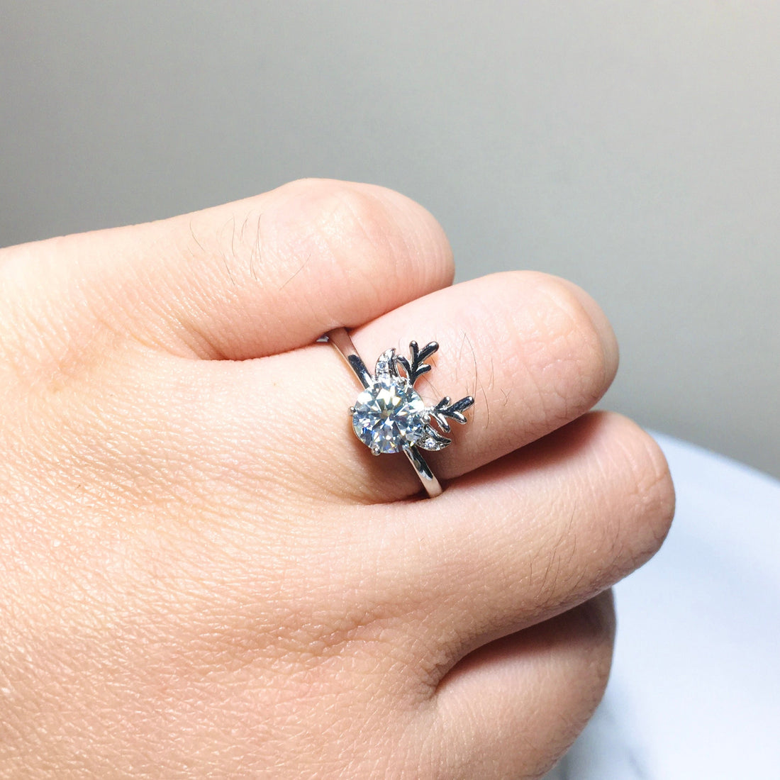 Cute Fawn Deer Horn Moissanite Halo 1ct Ring, White Moissanite Ring,Anniversary Engagement,Sterling Silver Rings,Gift for her,Birthday Gift