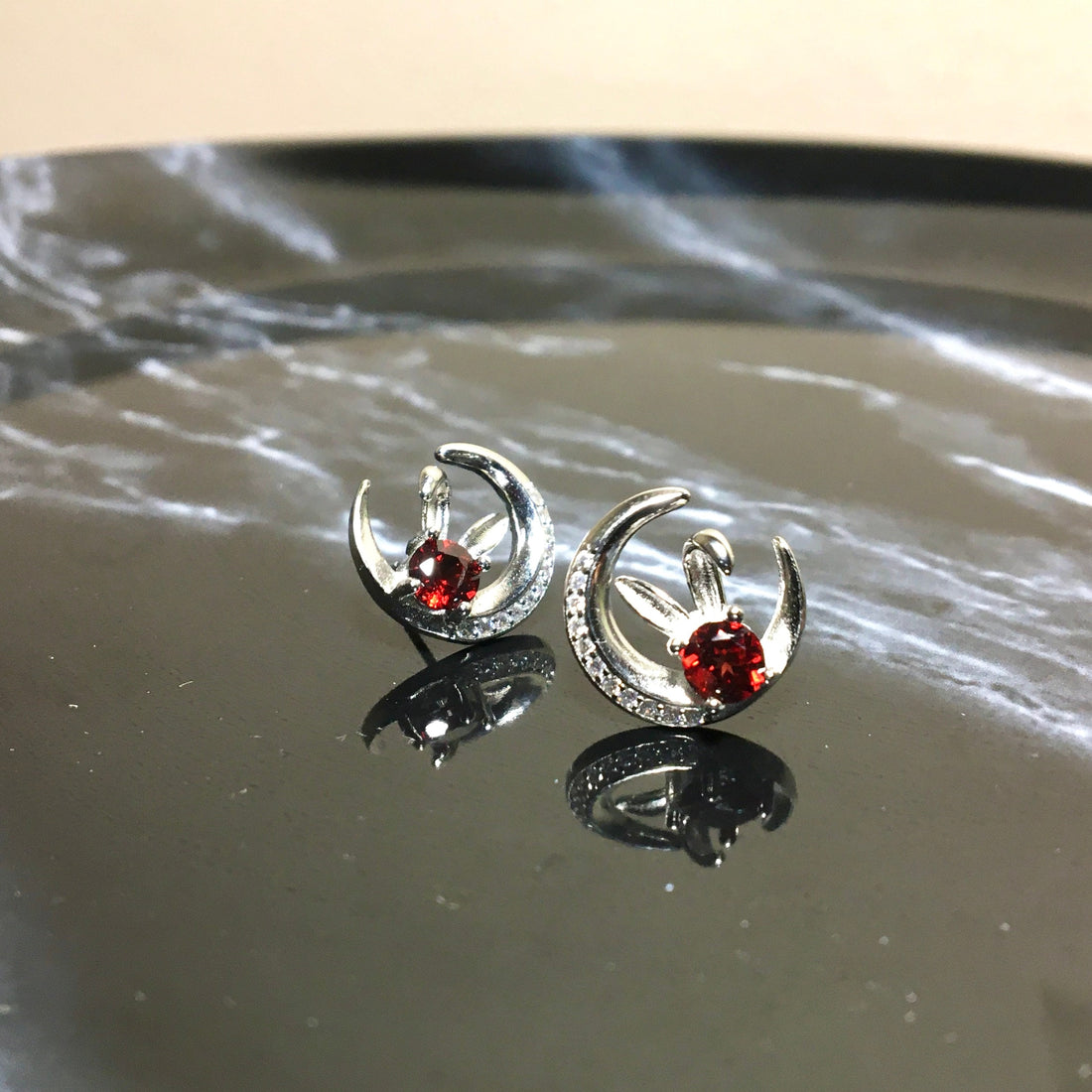 Handmade Easter Gift Garnet Rabbit and Moon Earrings - Crystal Gemstones,White Gold Plated Jewelry - Unique Handmade Graduation Gift for Her