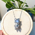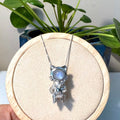 Blue Moonstone, Natural Crystal Gemstone Necklace,Gift for Her,Birthday,Silver Plated Copper,Space Cat Charm,Animal Theme Charm,Anniversary