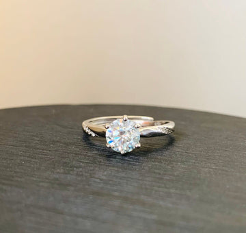 🥰This ring is a timeless classic with a touch of modern flavor – with six-evenly spaced prongs hugging the round 1 ct moissanite gemstone, the gemstone is guaranteed to shine even when looked at from a distance. The band features a set of gemstones carefully twirled around the band to create a soft, ribbon-like modern twist.